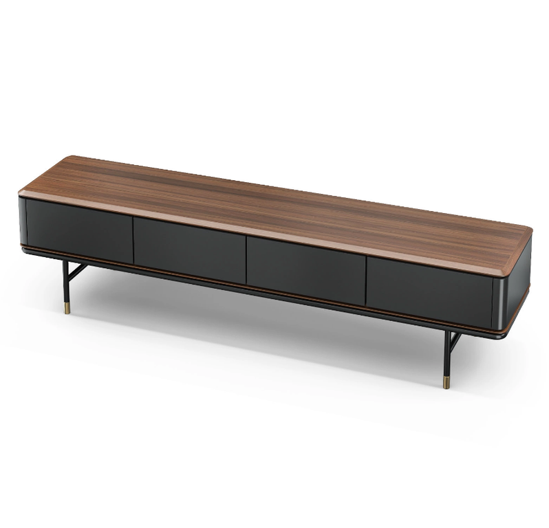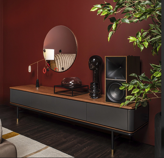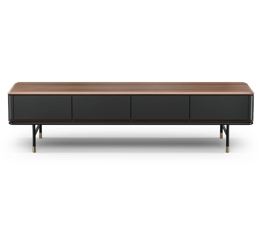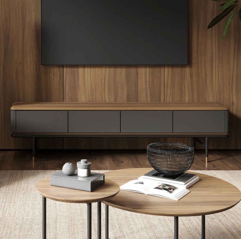 ТВ-тумба с четырьмя ящиками из коллекции Altea от MOD Interiors воплощает современный стиль с характерным акцентом середины прошлого века. Модель выделяется силуэтным дизайном: высокие черные ножки с латунными деталями подчеркивают элегантность, а матовые грифельно-серые фасады красиво играют светом.