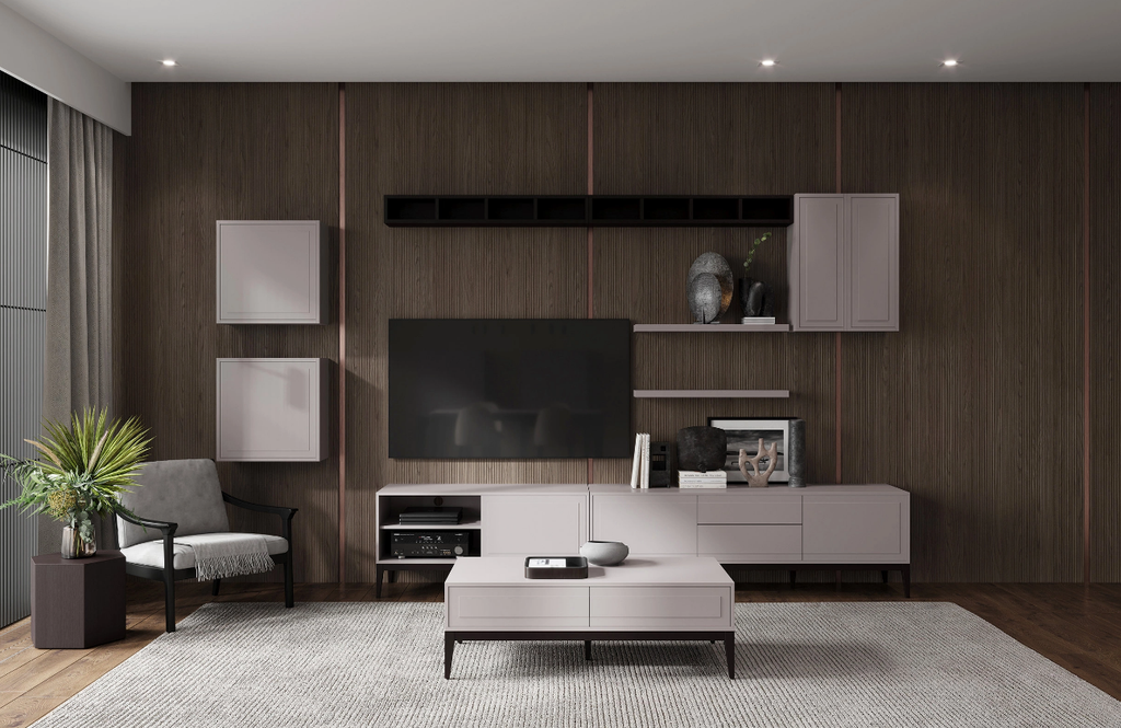 Фасады выполнены в элегантном сером матовом оттенке. Используется натуральный ореховый шпон, нанесённый на прочную МДФ высокой плотности. Ножки изготовлены из массива берёзы с натуральной текстурой, оттенок — темно-коричневый, почти черный.