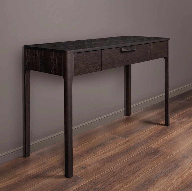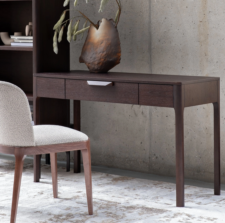 Письменный стол от MOD Interiors выполнен в современном стиле и прекрасно подойдет для домашнего кабинета или рабочего уголка. Верхняя часть изготовлена из прочной МДФ высокой плотности, а ножки и ручка — из массива натурального дерева.