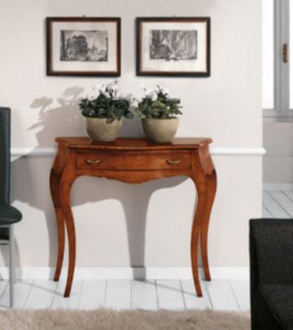 Стильная консоль от итальянской фабрики Giuliacasa станет ярким акцентом любого интерьера. Элегантная модель с выразительными изогнутыми ножками и плавной линией фасада смотрится особенно легко и изысканно. Выдвижной ящик обеспечивает удобное хранение мелочей, а натуральная отделка подчеркивает благородство массива ореха.