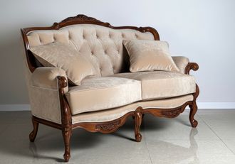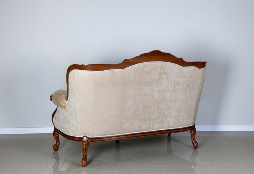 Этот элегантный двухместный диван легко станет достойным украшением гостиной, спальни или кабинета. Изделие выполнено в изысканном классическом стиле: изогнутая спинка, плавные линии подлокотников, резные деревянные элементы и “каретная стяжка” делают диван настоящим арт-объектом и подчеркивают статус вашего пространства.