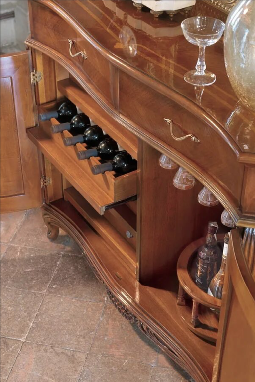 Изделия коллекции I DOGI выполнены из массива бука и липы, панели из массива ореха, фанеры. Интарсия этой коллекции производится путем комбинации шпона черешни и ореха.