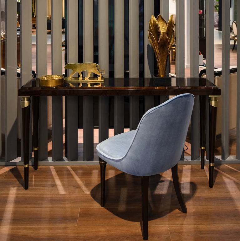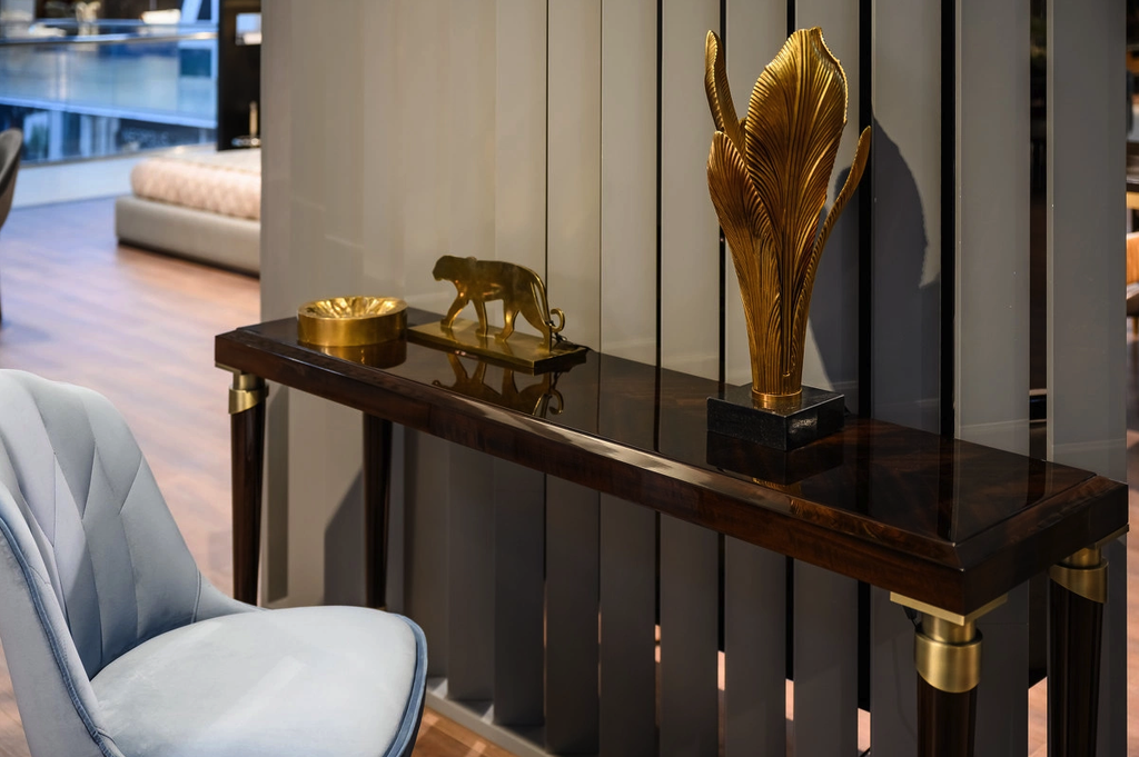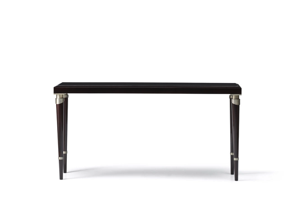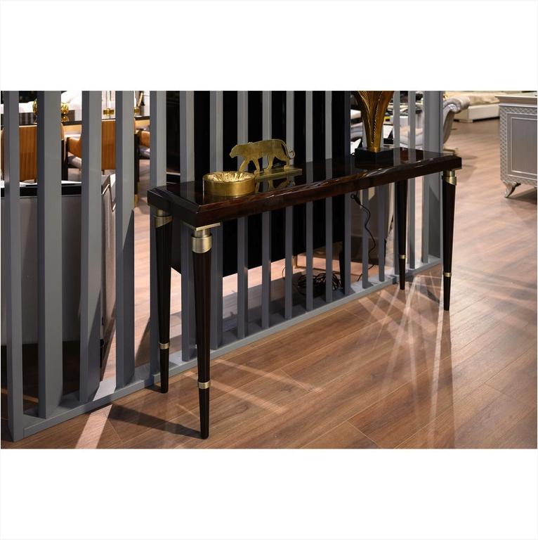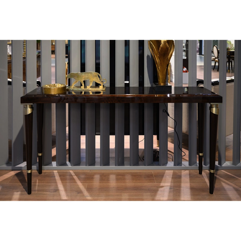 Консоль выполнена в стиле Ар-деко. Консоль изготовлена из высококачественного шпонированного МДФ высокой плотности. Ножки массив бука. Детали изготовлены из нержавеющей стали с латунным покрытием.