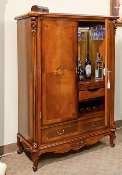 Комод-бар выполнен из натурального массива дерева, декорирован резьбой и инкрустацией из шпона.
