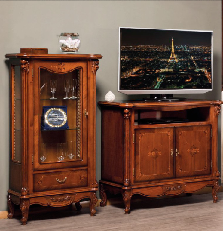 Комод выполнен из натурального массива дерева, декорирован резьбой и инкрустацией из шпона.