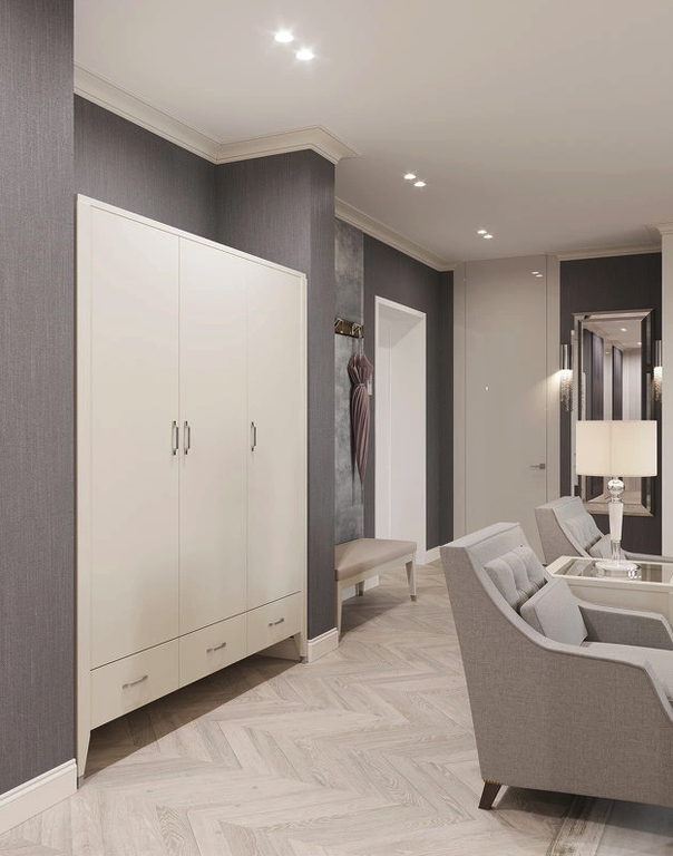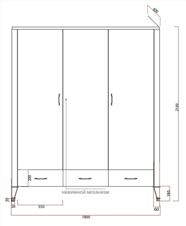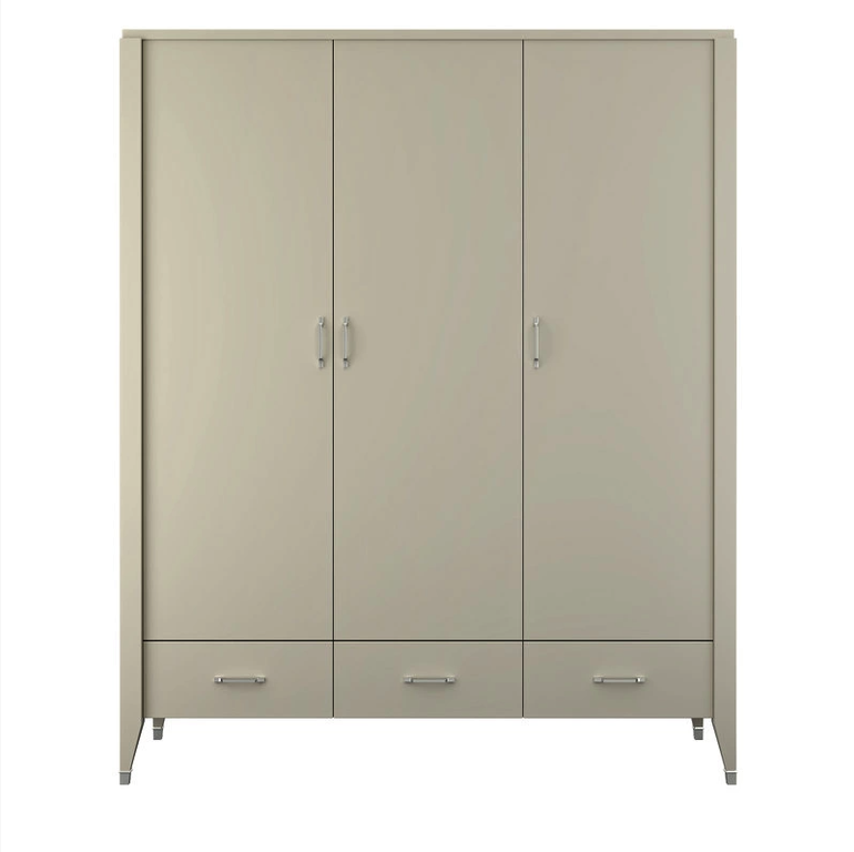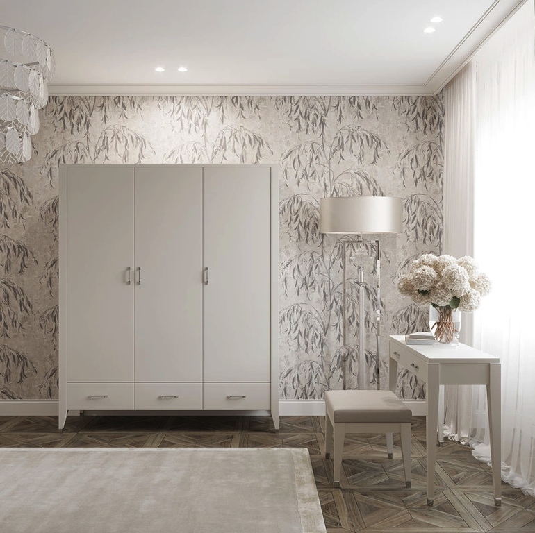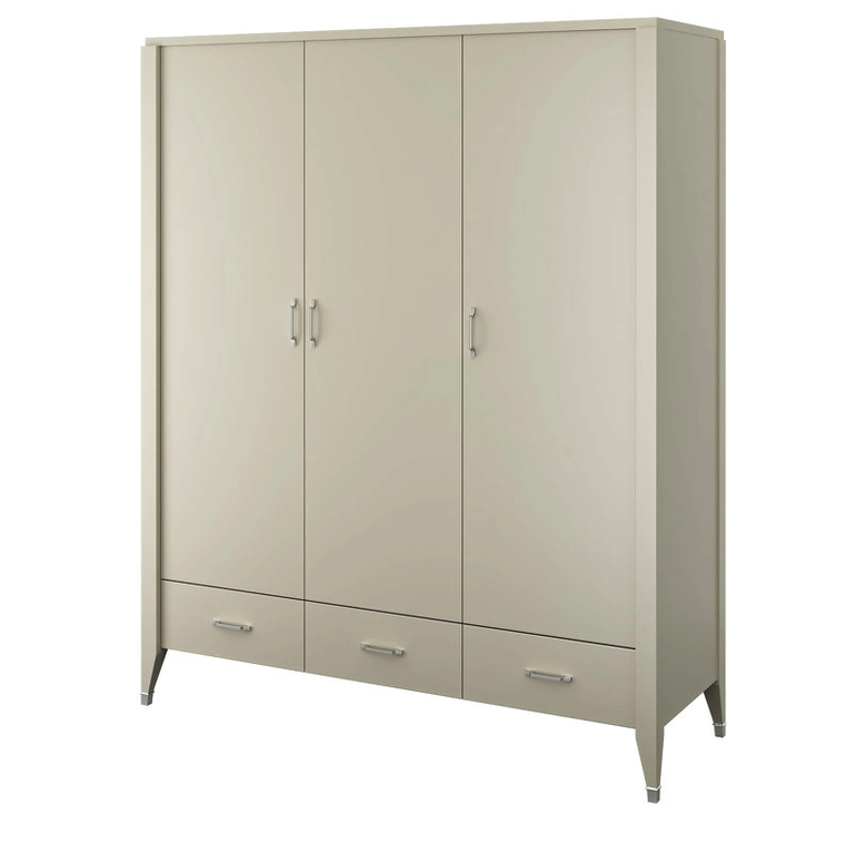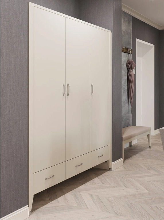 Гардероб БЕЗ ДЕКОРА НА НОЖКЕ. Гардероб на прямых ножках выполнен в стиле Ар-деко. Оснащен тремя дверцами и ящиками, центральная дверца с механизмом push to open, внутри полки и штанга для вешалок.